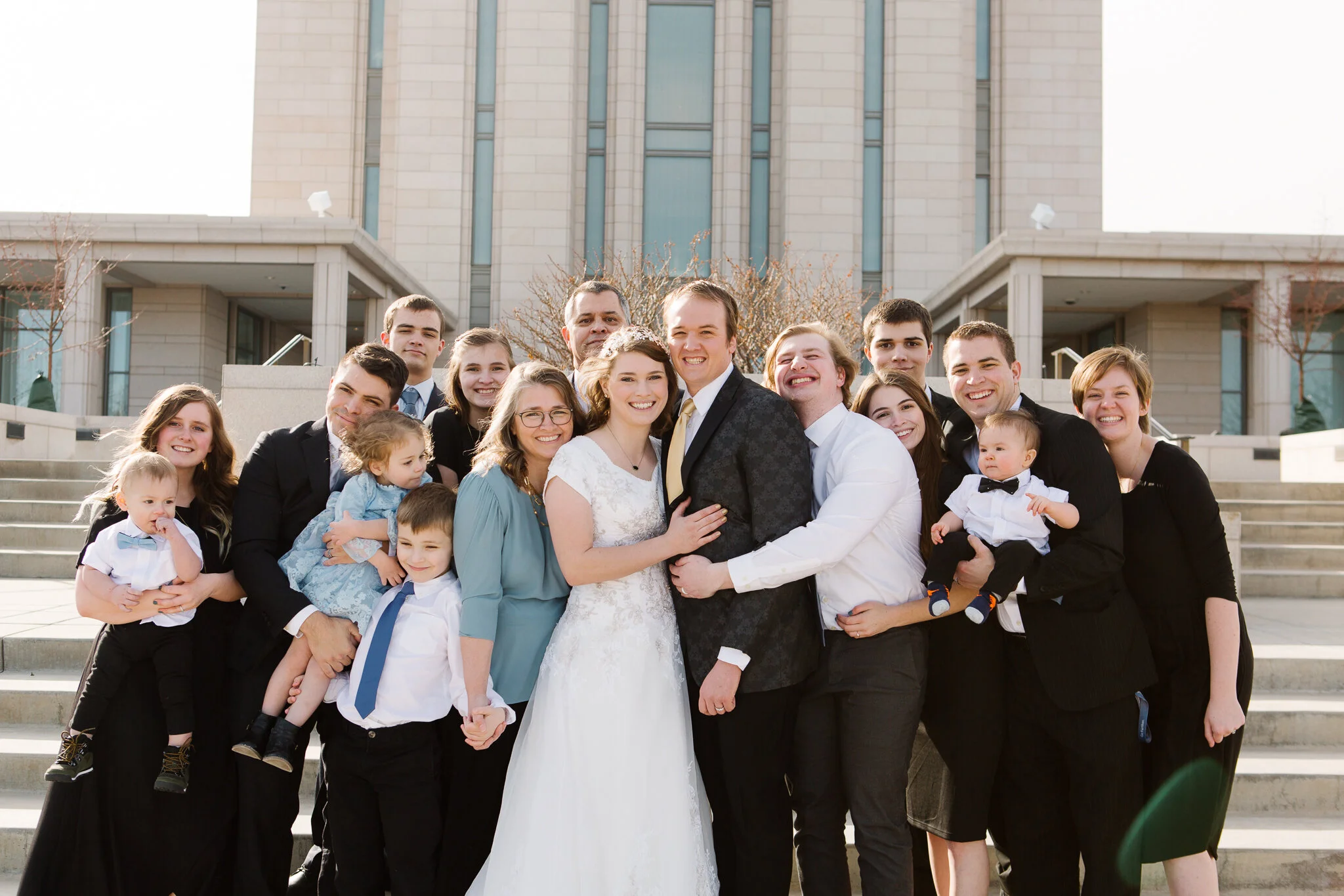 Tess and Steven had a beautiful February wedding day. It was a little chilly, but the sun was out and everything went great! Their wedding party was so much fun. I loved how Steven wanted to show off his ring to the bridesmaids and I love how his groomsmen insisted on posing like police officers since Steven is one. Tess and Steven are so fun. I loved taking pictures of them around the temple. We made sure to take pictures of them in the exact spot where they got engaged. It was great.